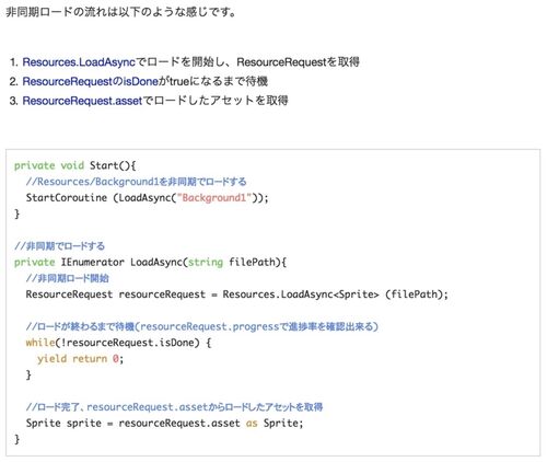 この記事でのバージョン Unity 2017.2.0f3 はじめに 今回はResourcesのアセットを非同期でロードする方法のご紹介です!ロードするサイズや量があり、普通にロードしてしまうと処理落ちしてしまう時に使えます。 目次 はじめに 目次 Resources.LoadAsync 注…
