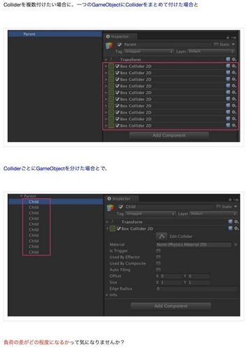 この記事でのバージョン Unity 2017.4.0f1 はじめに Unityで当たり判定を実装する時にはCollider(2D)を使いますが、Colliderを複数付けたい場合に、一つのGameObjectにColliderをまとめて付けた場合と ColliderごとにGameObjectを分けた場合とで、 負荷の差…