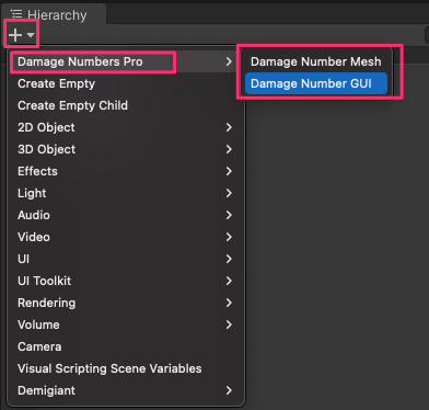 まず、HierarchyウィンドウのDamage Numbers Proからオブジェクトを作ります。
