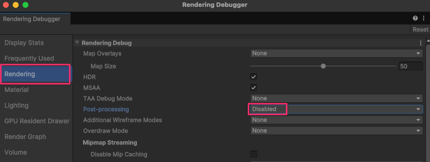 ちなみにRenderingタブのPost-processingをDisabledにする事で、
