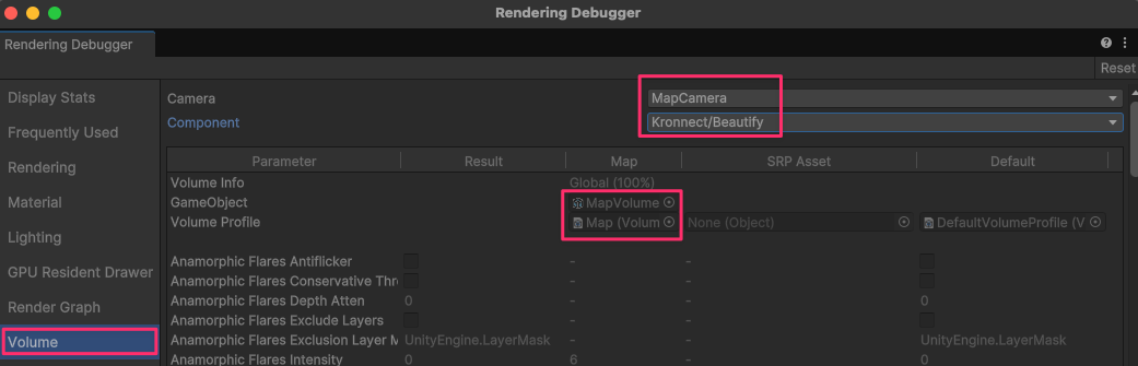 左のVolumeタブを選択後、任意のCamera及びポストプロセスの種類を選択すると、