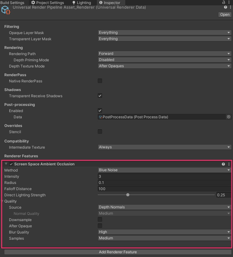 Universal Renderer DataにScreen Space Ambient Occlusionを追加します。