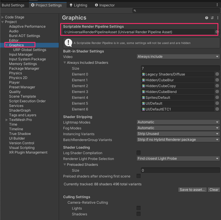 GraphicsにあるScriptable Render Pipeline Settingsを選択し、
