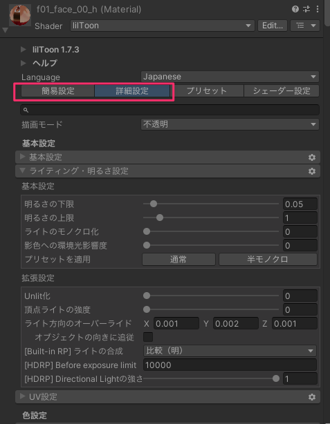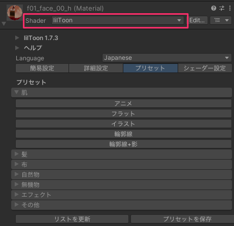 使い方は他のシェーダー同様に、マテリアルでlilToonを選択するだけ。