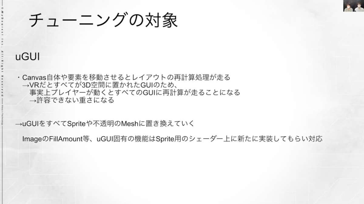 解像度とMSAAのバランスをとってパフォーマンスを上げることや、uGUIとVRゲームの相性の悪さなど、